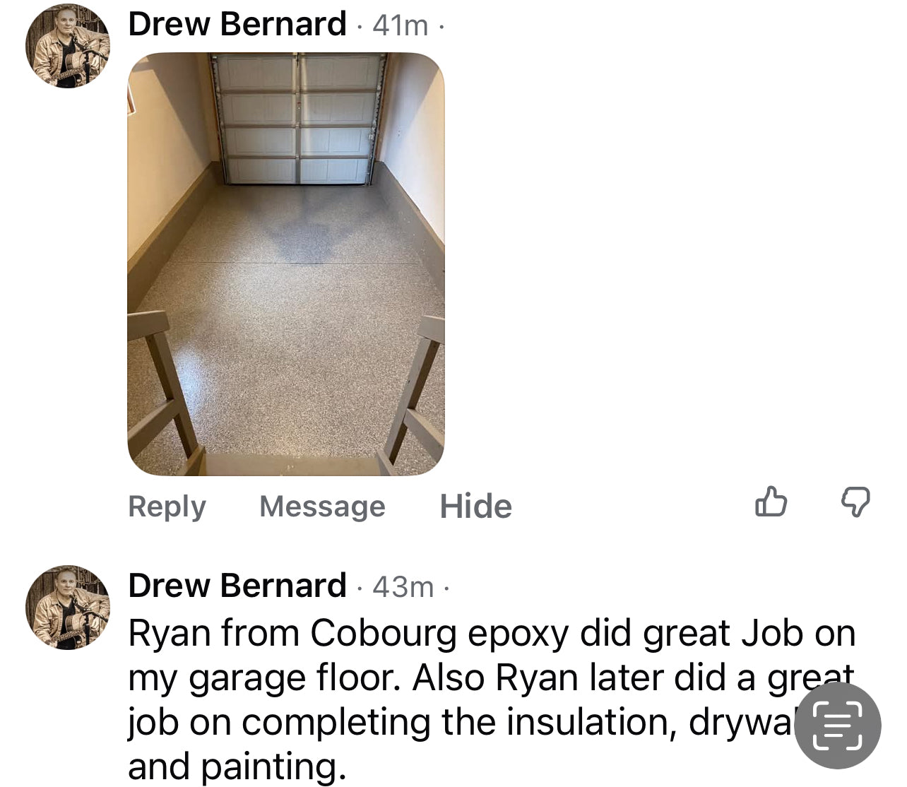 Free, No obligation quotes, email us at info@cobourgepoxy.ca